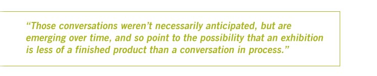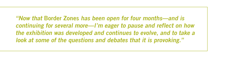Those conversations weren’t necessarily anticipated, but are emerging over time, and so point to the possibility that an exhibition is less of a finished product than a conversation in process. In the ensuing weeks, this page will become a kind of “Curator’s Journal” about Border Zones: a behind-the-scenes look at how the show was put together, reflections on broader issues of boundaries and translations and how these have come to be performed at the museum, and ongoing dialogues between the art works, the museum, and you, our viewers and readers. I welcome your ideas and questions.