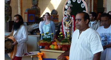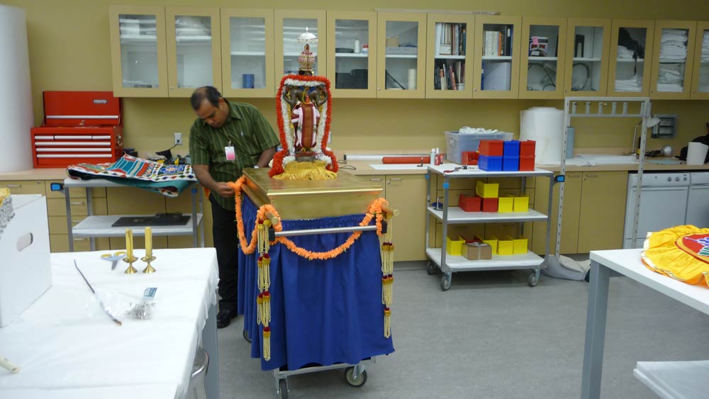 Prabakar Visvanath, the local Hindu priest who had worked with museum staff to create Abishekam for the Border Zones show, had just wheeled MOA’s bronze Vishnu figure into the room in MOA’s office area. With this act, Room 219A became a sacred space, and the final preparations for a public Vishnu procession could begin. The figure, a finely cast bronze artifact at least a century old, was originally created as an utsava murti (festival image), meant to be taken out of the temple among the worshippers. Today’s event was going to be the first such outing for MOA’s Vishnu since it was acquired 25 years ago. The procession was billed as a continuation of the ritual documented in Abishekam, in which the continuing “life” of an artifact is performed through contemporary ritual and connection with the local community. Prabakar had already decorated the museum’s stainless-steel trolley to transform it into a ratha, or chariot. He had prepared and dressed the figure—now securely positioned on the cart—with rich cloths, garlands, and jewels, so that it was no longer an artifact to contemplate as sculpture, but a sacred vessel for the Vishnu deity to enter and perhaps gaze upon the worshippers. But just as the abishekam confronts museum definitions of object care, ritual doesn’t always fit within museum timetables or expectations of “performance.” The chanters were late. And once they arrived, ritual protocol took precedence over entertainment. An order of events determined by the spiritual leaders needed to take place out of the public eye, within the threshold marked by the shoes. The scheduled start time of 11:00 a.m. had come and gone before chanting of the Sahasranaama—the 1000 names of Lord Vishnu—finally began. Inside the room, we stood and listened; outside, an announcement of a further delay was made to the waiting audience. Museum staff furtively checked their watches; the chanting of names continued, rhythmically, peacefully.