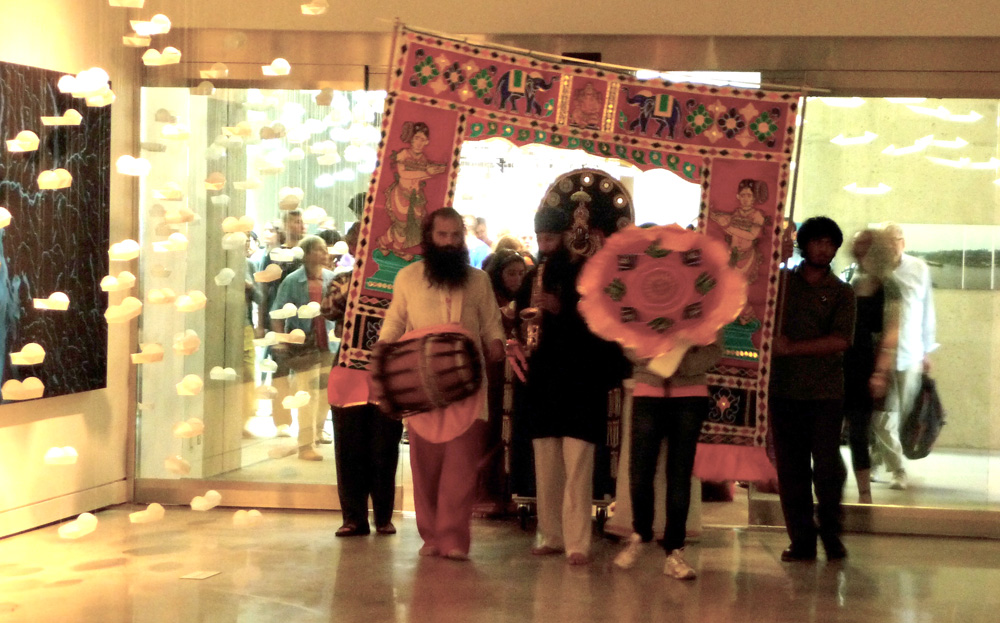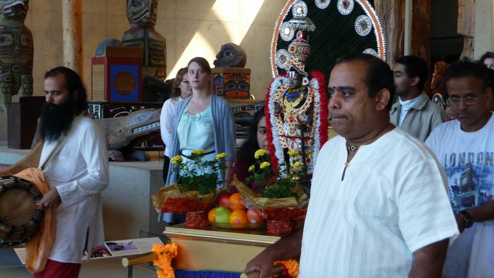 Then, with the vibrant sounds of drumming, fusion-jazz saxophone, recorded sitar, and singing, the procession began. Some museum visitors had come especially to witness this event; others were startled to see the cacophonous procession weave its way among the totem poles. The chariot and stream of worshippers, museum staff, and primarily non-Hindu visitors navigated a circuitous route through the museum’s Great Hall and Border Zones. In a confluence of past and present, both live and mediated, the group passed in front of the Abishekam video-installation—the priest and the image of Vishnu captured at once on video and in silhouette—before heading out of the gallery again, past Bill Reid’s Raven peering quizzically at the goings-on below, and ultimately back to the sanctum of Room 219A. The procession made clear that it’s not only the physical object that is our focus—even in an exhibition of contemporary art, or in a museum of cultural treasures from around the world. It is the object’s place within changing, moving, uprooted, re-routed, and perhaps even unrelated cultures that troubles our assumptions about borders and how they separate us in time and space.