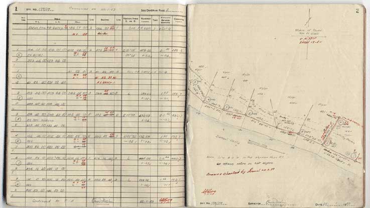 This image of a surveyor’s map creates a dialogue with the video work. It provides an objective record of the history of that shifting landscape and emphasizes what was recounted orally within the film—plus its existence points to an actual survey which pre-dates and echoes the appearance of surveyors in the piece.